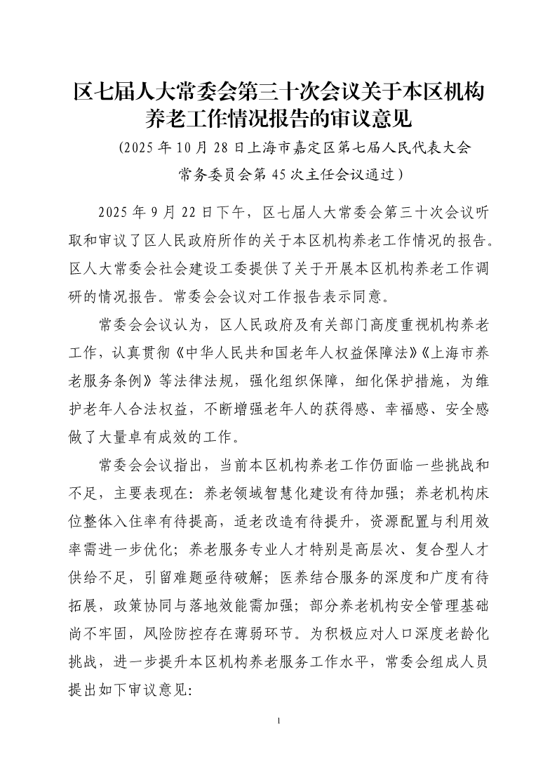 区七届人大常委会第三十次会议关于本区机构养老工作情况报告的审议意见